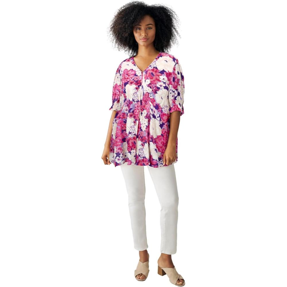 Ellos Plus Size Button Front Crinkle Tunic(Raspberry Sorbet Floral)