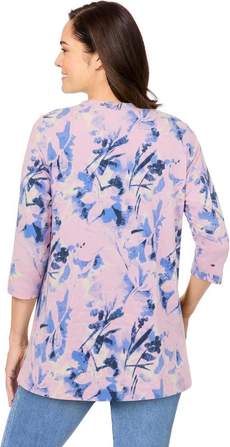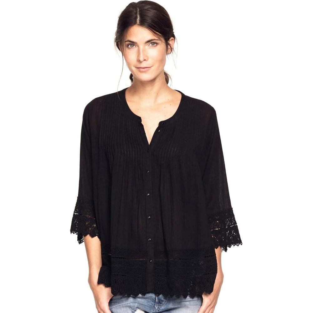 Pintucking in front and back with crochet trim at 3/4 sleeves and hem. Button front. Round neckline. Approx. 30″ hits below hipbr>Cotton crepebr>Machine wash coldbr>Imported