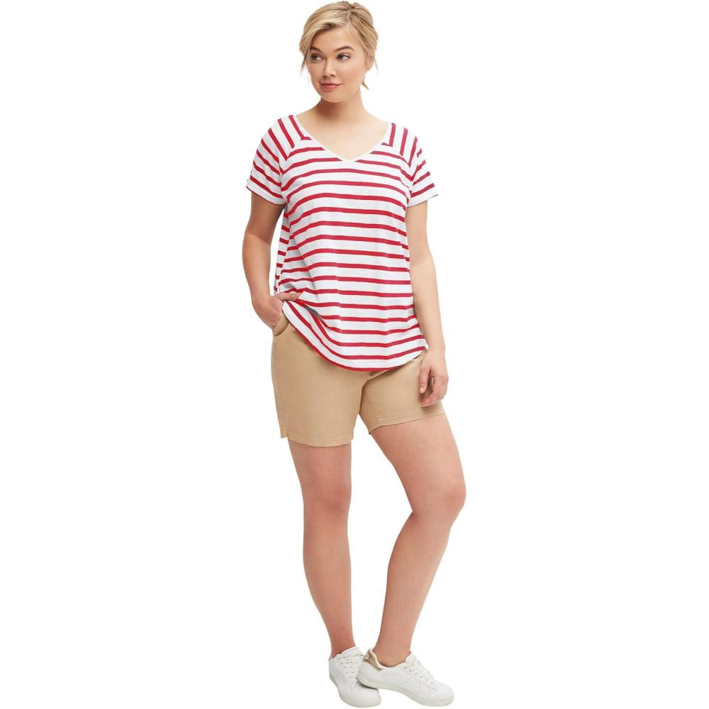 Ellos Plus Size Rounded V-Neck Tee(Chili Red White Stripe)