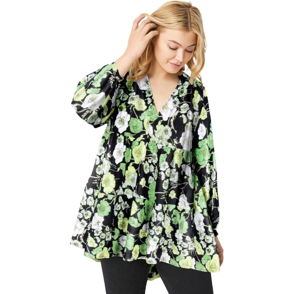 Ellos Plus Size Tiered Tunic With Notch V-Neck(Black Green Floral)