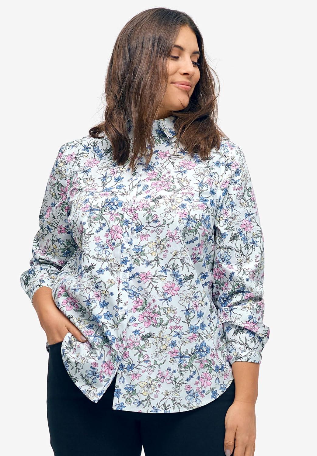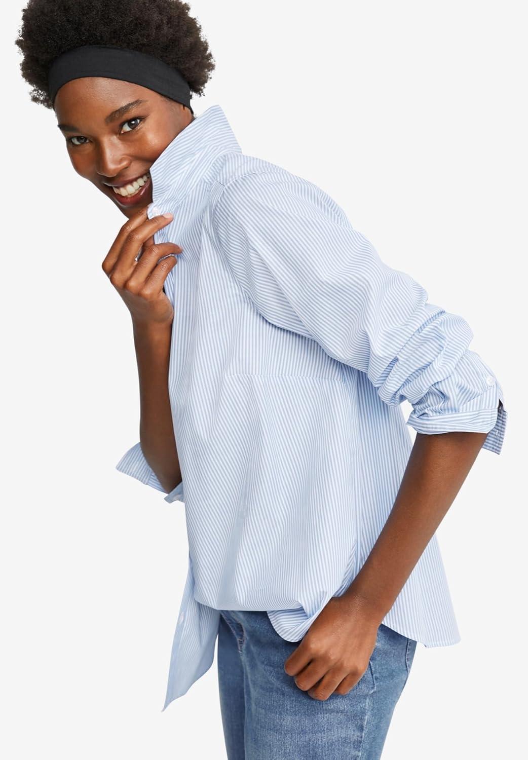 ellos Women’s Plus Size Long Sleeve Button-Down Shirt Oversized Tunic Blouse(French Blue White Stripe)