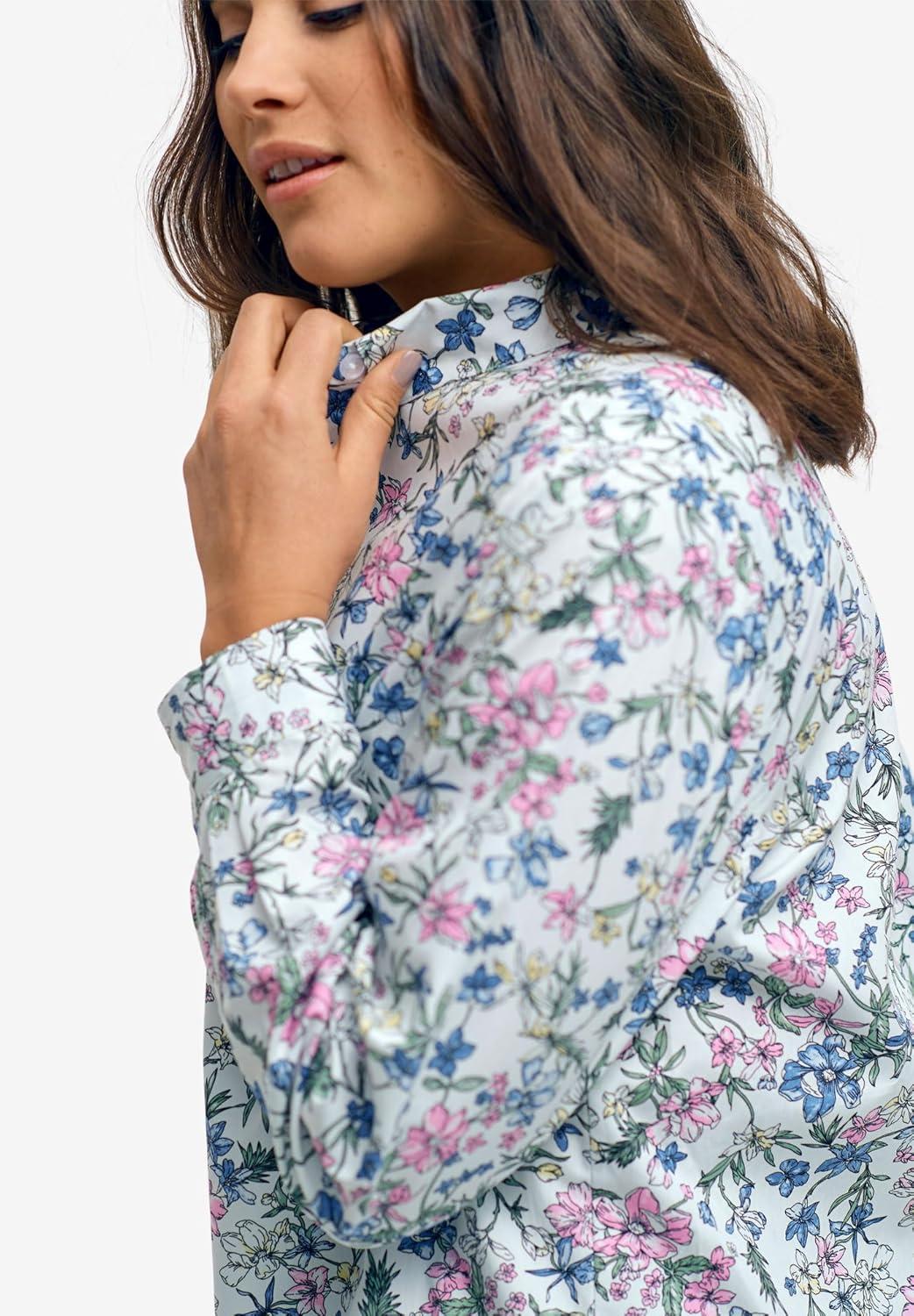 Woven shirt with collar and button front. Long sleeves with adjustable cuffs. Back yoke with box pleat. Slight shirttail hem. Approx. 30″ hits below hipbr>Cotton woven poplinbr>Machine wash coldbr>Imported