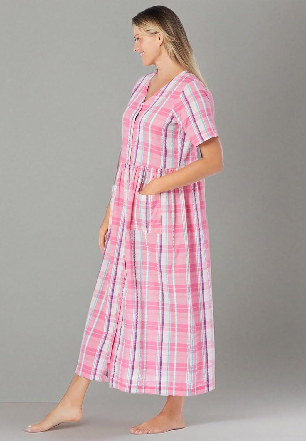 Made in lightweight seersucker fabric for warmer weather, this lounge dress looks great and keeps you cool. A snap-button front and shirred empire waist give the look of a casual dress that makes this perfect for wearing around the house. Patch pocketsbr>Regular: 52″ lengthbr>Pure cotton, importedbr>Machine washable