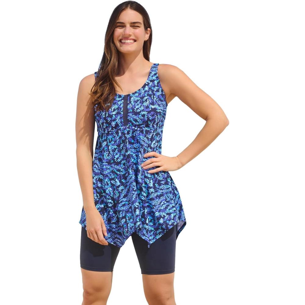 A chic handkerchief hem that adds a touch of flair to our scoop neck tankini. A pretty mesh detail at the front and an empire waist accentuate your curves and provide a flattering fit. Pair with your favorite swim bottoms for full coverage and a stylish look by the water. Built-in power-mesh bra with sewn-in foam cups. Adjustable straps. Solutions: Bust Support and UPF 50 Sun Protectionbr>36″ lengthbr>Nylon/spandexbr>Hand wash with mild soap. Roll suit in a towel and squeeze out excess water. Dry flat. Avoid washers and dryers.br>Imported Close Back Details “UPF” stands for Ultraviolet Protection Factor