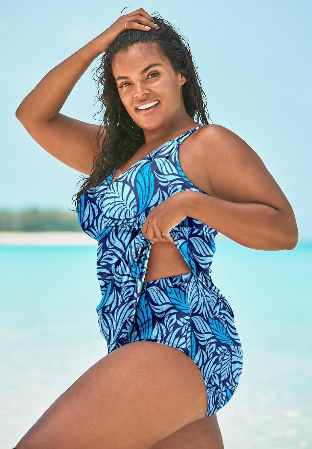 Swimsuits For All Swim 365 Women’s Plus Size Loop-Strap V-Neck Tummy Control Two-Piece Swim Dress(Deep Blue Leaf)
