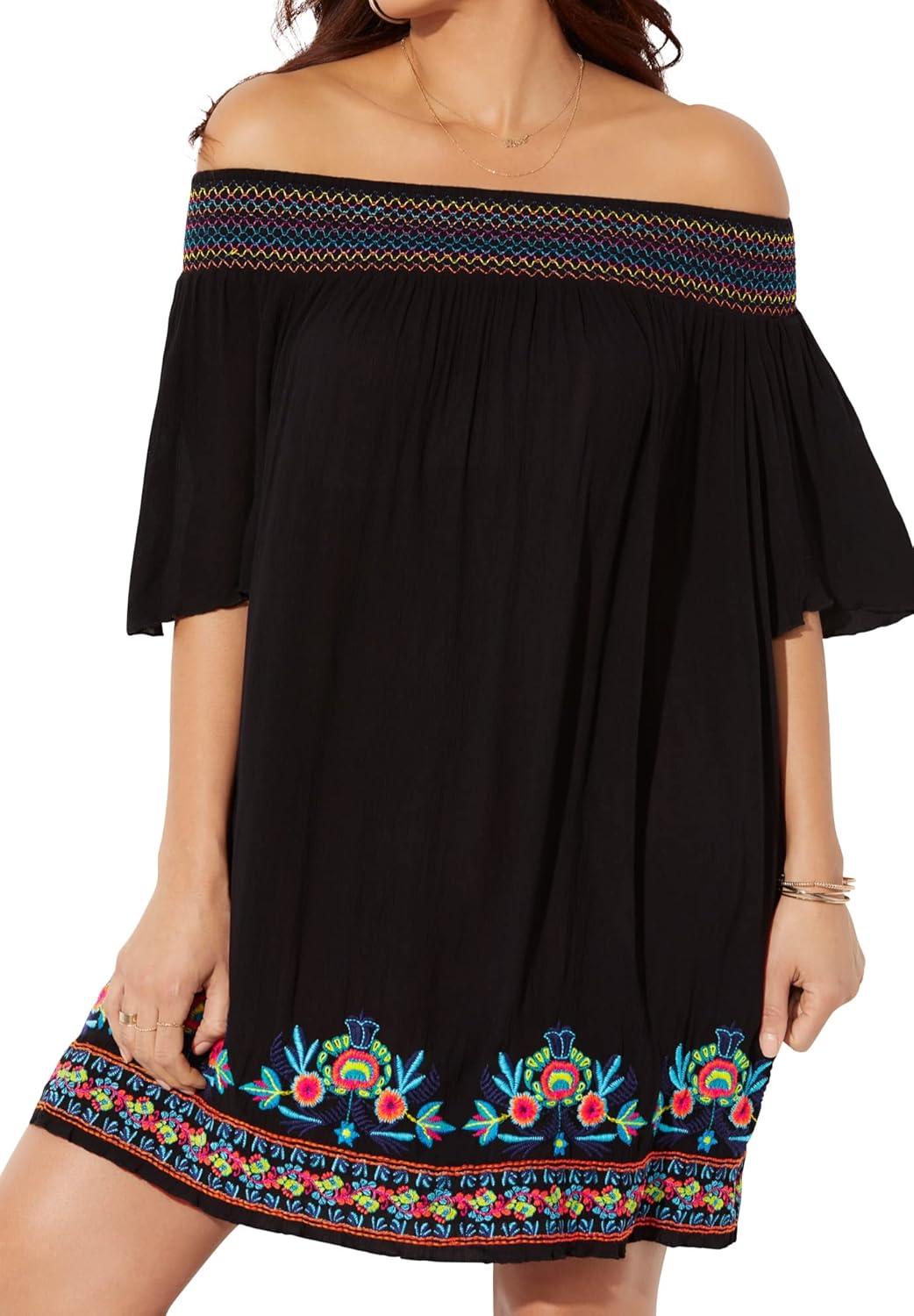 br>Beautiful off-the-shoulder design keeps you stylish and cool from pool to beach.br>Elegant embroidery at the chest and hem adds a touch of sophistication.br>Elbow-length sleeves provide comfortable coverage and a relaxed fit.br>38″ length for the perfect amount of coverage.br>Soft, lightweight rayon fabric ensures all-day comfort.br>Easy-care with hand wash instructions for lasting quality.br>Imported