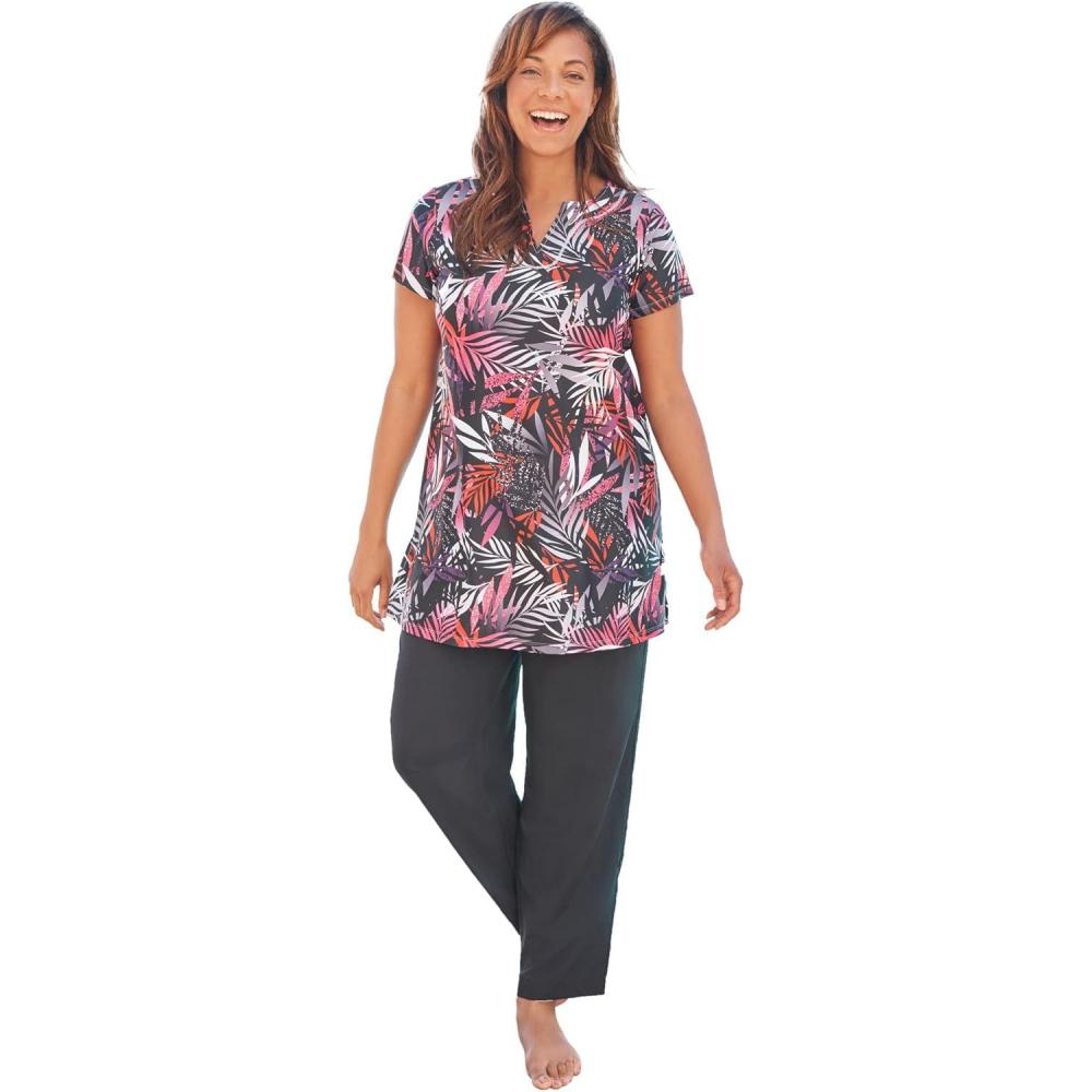 Looking for a tunic to throw over your swimsuit? This one provides an extra dose of fashion and UPF 30+ sun protection. Split neckline, side slits and a bevy of beachy patterns make it a swim must-have choice. Like all Swimsuits for All styles, it’s designed by our experts for an unparalleled fit. Split neckShort sleevesSide slitsRelaxed fitUnlined topThis style does not feature a bra or bra cupsWear swim tee over your swimsuit, in & out of the water. Does not feature a built-in shelf bra. 82% Polyester/18% Creora SpandexFabric provides UPF 50 UV protection. .Creora fabric provides UPF 30+ UV protectionHand wash with mild soap. Roll suit in towel & squeeze out excess water. Dry flat; avoid washers & dryers.Imported 34″ Front diagonal length – high point on shoulder to hem on size 18/20Solutions: Chlorine Resistant, UPF 50 Sun Protection Close Back Details