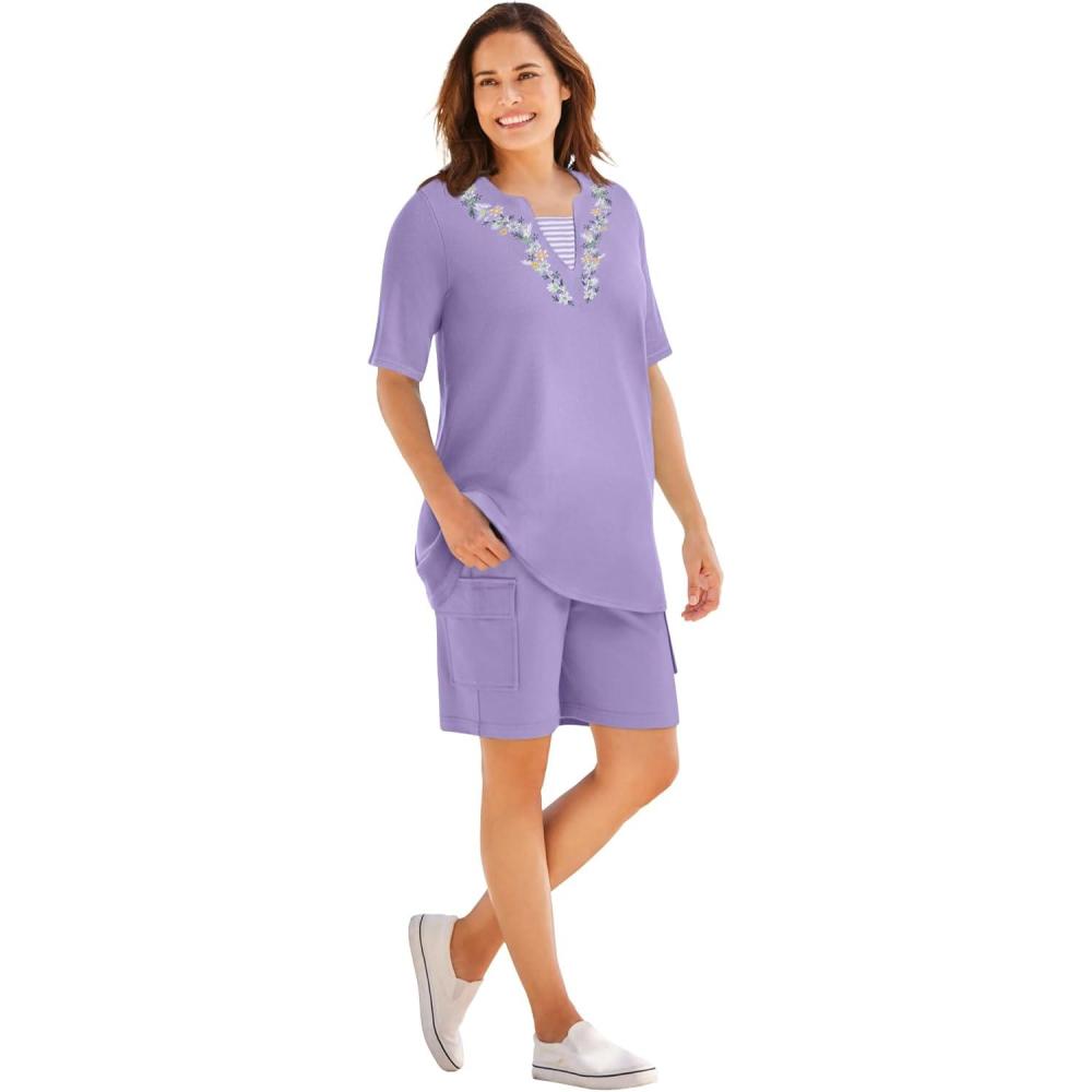 Woman Within Plus Size 7-Day Embroidered Layered-Look Tunic(Soft Iris Flower Embroidery)