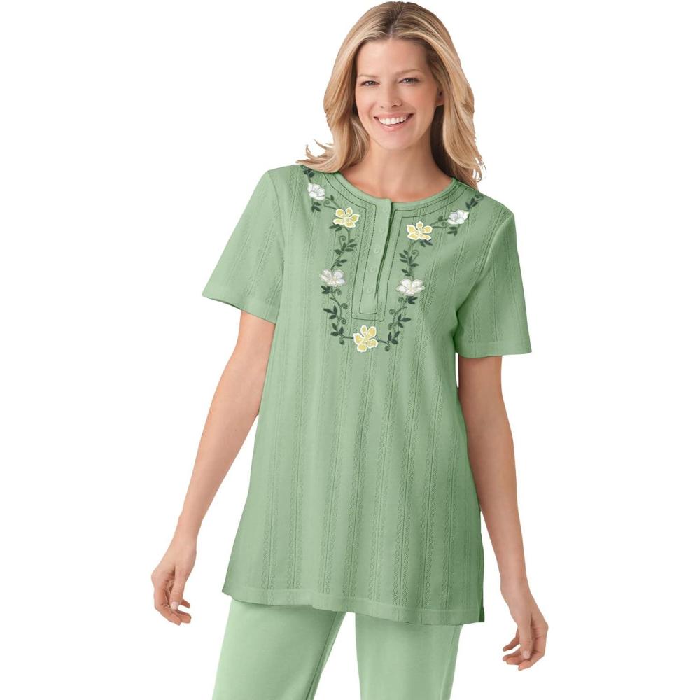 Experience lightweight comfort with our airy pointelle knit fabric. br> Beautifully embroidered floral design enhances the Henley neckline for a sophisticated touch. br> Relaxed fit with short sleeves and buttoned front ensures effortless style and ease of movement. br> Convenient side hem slits allows for movement. br> 30″ length gracefully hits at the upper thigh, perfect for versatile pairing. br> Soft cotton/poly blend for breathability. br> Easy care – simply machine wash to maintain its fresh look. br> Imported.