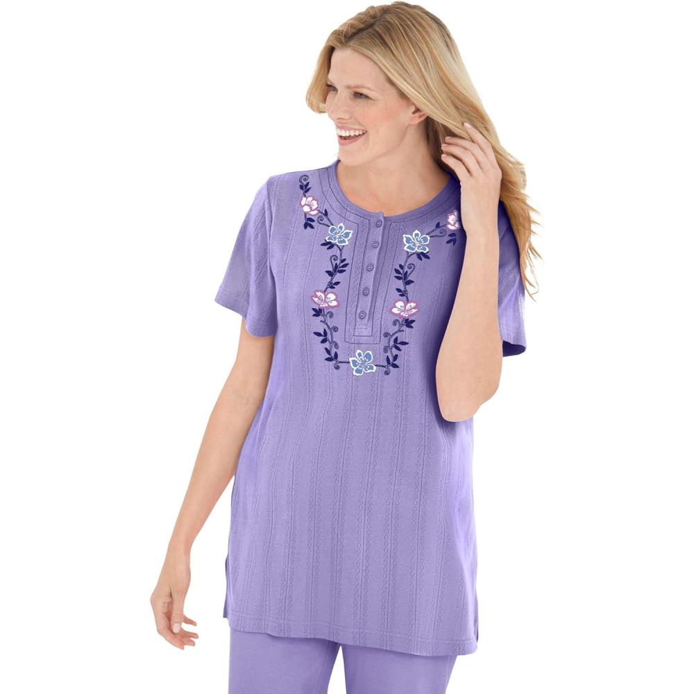 Experience lightweight comfort with our airy pointelle knit fabric. br> Beautifully embroidered floral design enhances the Henley neckline for a sophisticated touch. br> Relaxed fit with short sleeves and buttoned front ensures effortless style and ease of movement. br> Convenient side hem slits allows for movement. br> 30″ length gracefully hits at the upper thigh, perfect for versatile pairing. br> Soft cotton/poly blend for breathability. br> Easy care – simply machine wash to maintain its fresh look. br> Imported.
