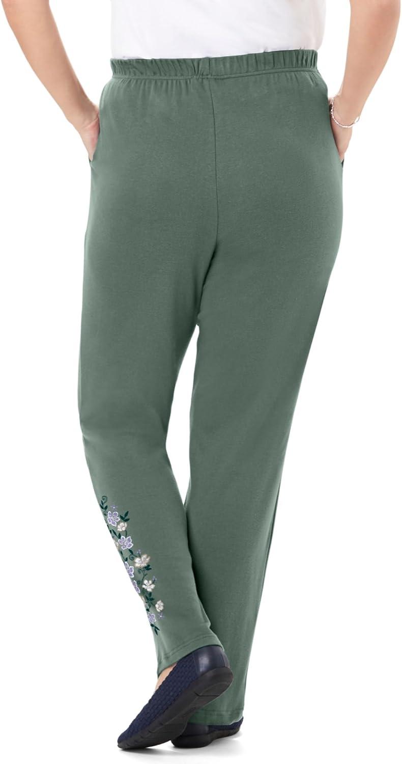 Woman Within Plus Size 7-Day Knit Embroidered Straight-Leg Pull-On Pants(Pine Floral Embroidery)