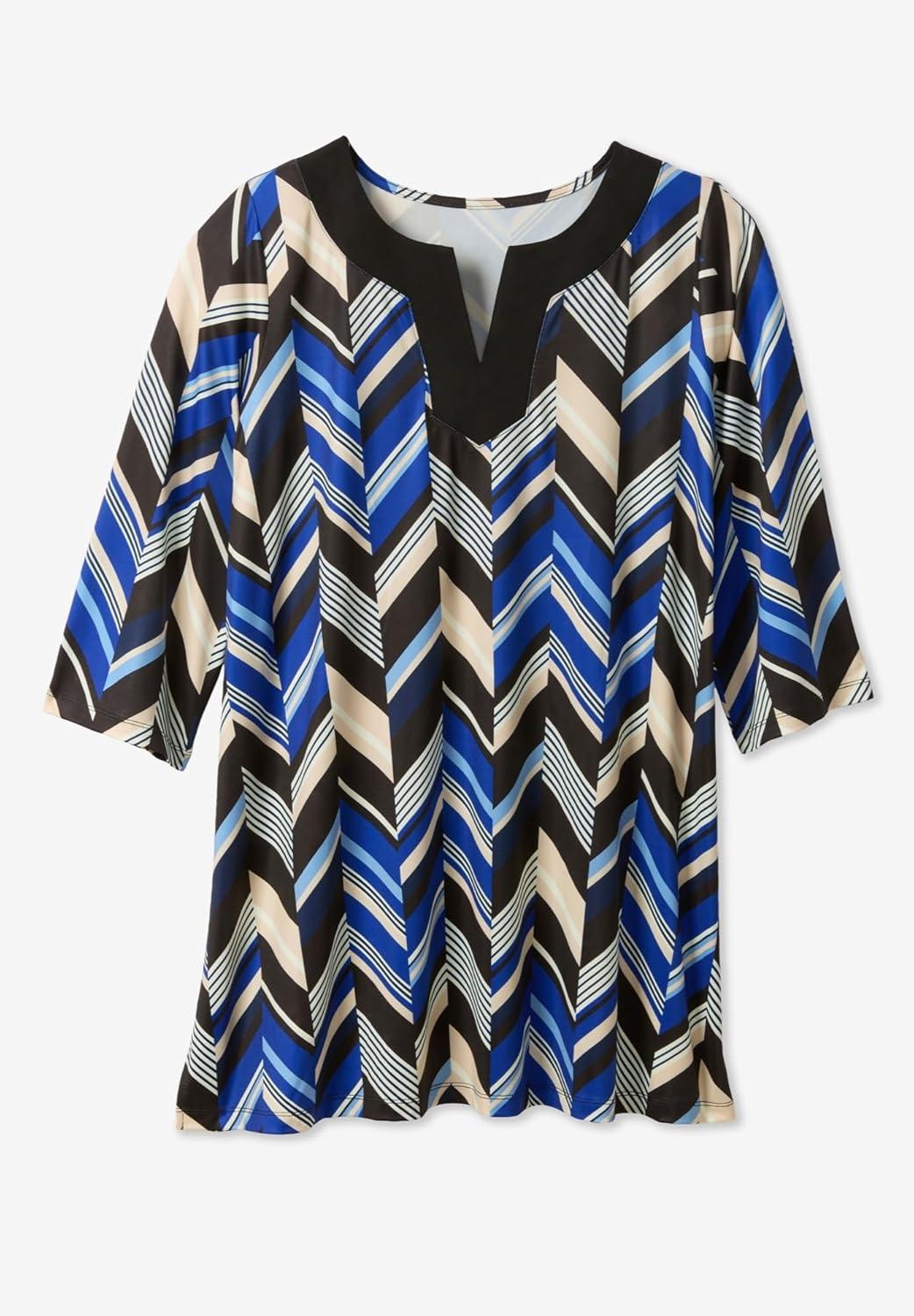 Woman Within Plus Size Contrast Notch-Neck Three-Quarter Sleeve Knit Tunic(Black Dotted Geo)