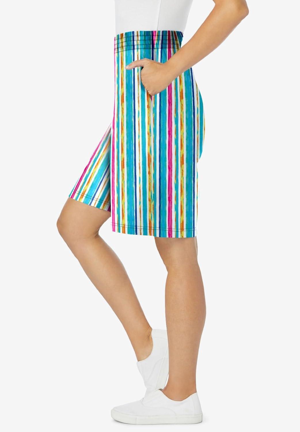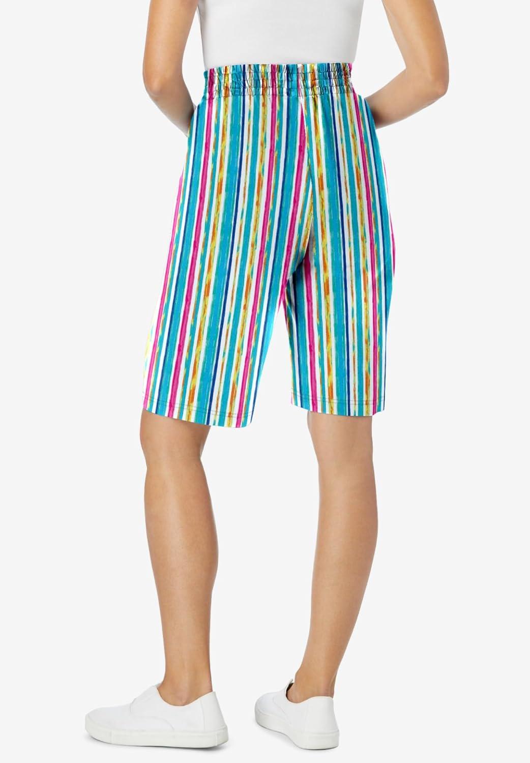 Woman Within Plus Size Elastic-Waist Knit Short(White Multi Watercolor Stripe)