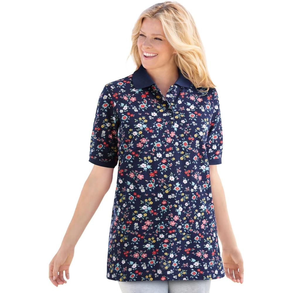 Woman Within Plus Size Elbow-Sleeve Polo Tunic(Navy Graphic Bloom)