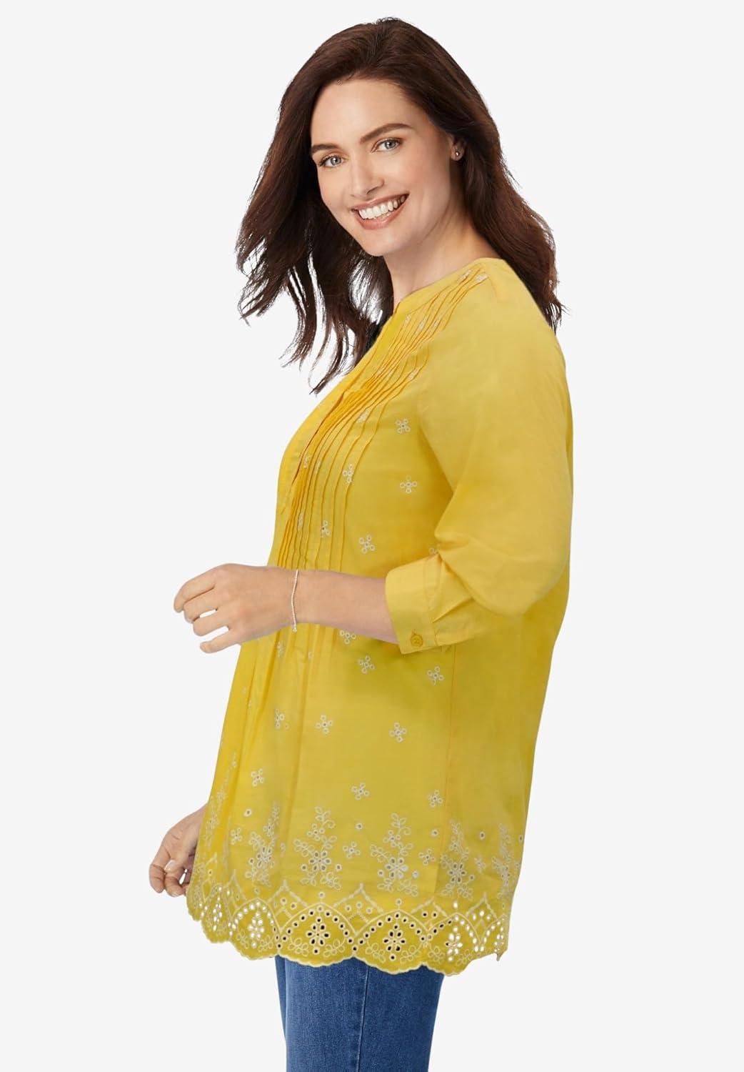Woman Within Plus Size Embroidered Pintuck Tunic(Primrose Yellow Eyelet Embroidery)