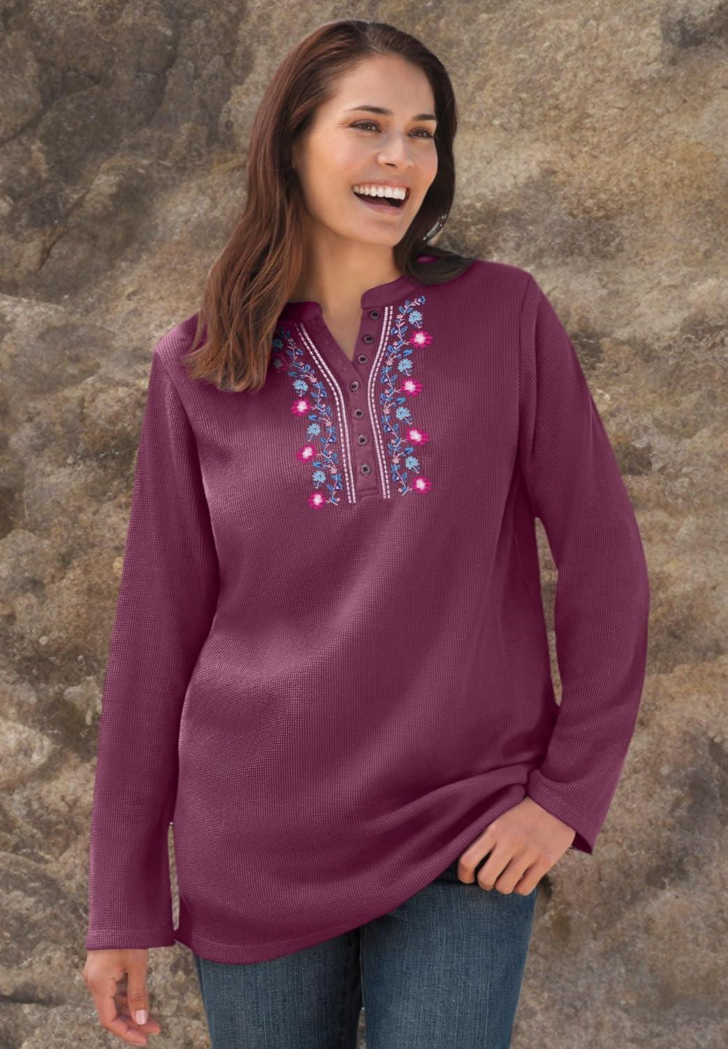 Woman Within Plus Size Embroidered Thermal Henley Tee(Deep Claret Vine Embroidery)