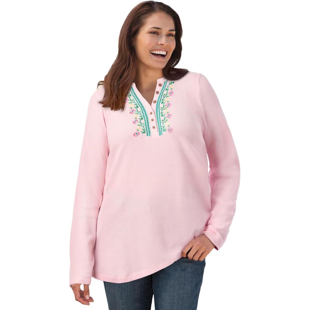 Woman Within Plus Size Embroidered Thermal Henley Tee(Pink Vine Embroidery)
