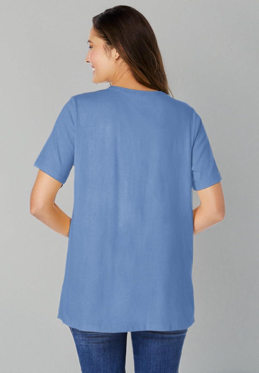 br>Beautiful eyelet embroidery at the neckline lends a feminine touch to elevate your everyday tee. br> Made from a comfy and breathable cotton/poly blend for all-day ease and lightweight wear. br> Relaxed fit ensures comfort while flattering your figure, making it easy to move in and stylish to wear. br> Perfect for pairing with jeans, leggings, or skirts for a versatile addition to your wardrobe. br> 28″ length provides coverage while maintaining a casual, chic look. br> Available in a variety of vibrant colors to match any outfit or mood. br> Machine washable for easy care and convenience. br> Cotton/poly blend for a soft, durable construction. br> Imported.
