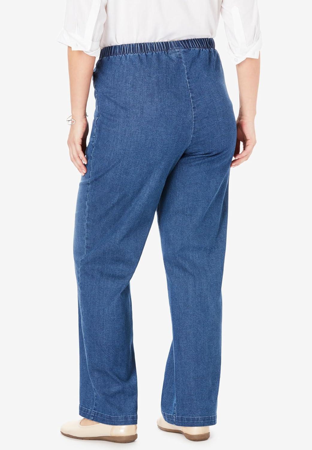 Designed with stretch to give you the perfect fit, these jeans feature an all-around covered elastic waistband for pull-on ease. Flat slant pockets in the front and a pocketless back achieve a smooth look. These wide-leg jeans fit over your favorite shoes for a fashionable silhouette. Full covered-elastic waistband. br> Features flat front pockets and no back pockets for a clean, streamlined look. br> Designed with a wide-leg silhouette for timeless style. br> Experience all-day comfort with a slight stretch in the fabric. br> Sits comfortably at the waist, perfect for daily wear. br> Available inseams: Average 30″, Petite 28″, Tall 34″. br> Blend of cotton/poly/spandex for durability and flexibility. br> Easy care – machine washable for convenience. br> Choose from a variety of stylish colors and twill finishes. br> Imported