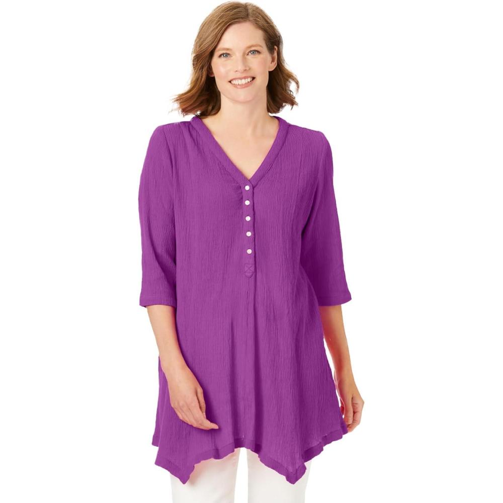 Woman Within Plus Size Handkerchief Hem Henley Tunic(Purple Magenta)