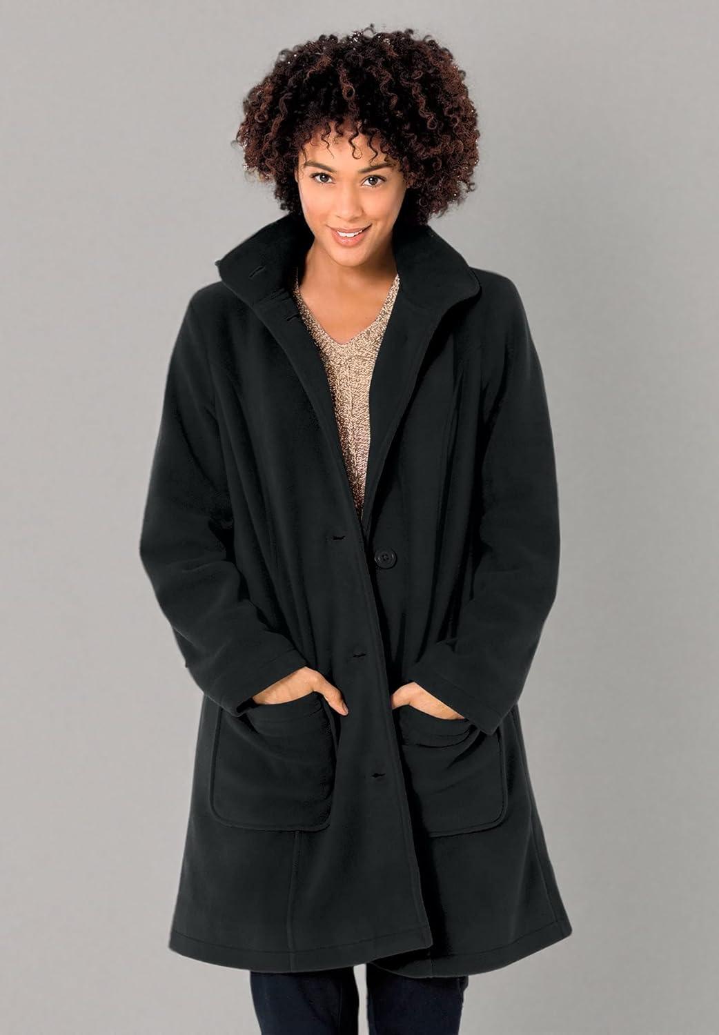 Woman Within Plus Size Hooded A-Line Fleece Coat(Black)