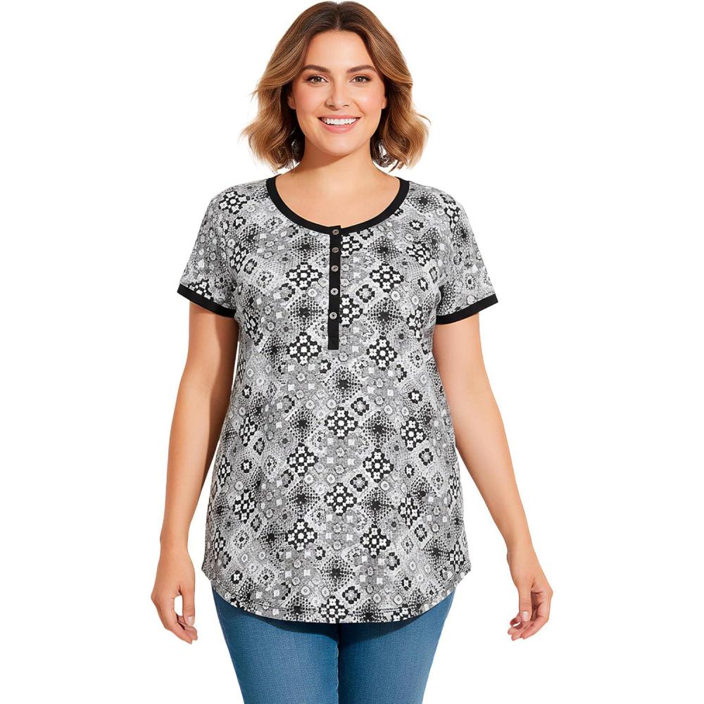 Woman Within Plus Size Knit Henley Tunic(Black Tile Patchwork)