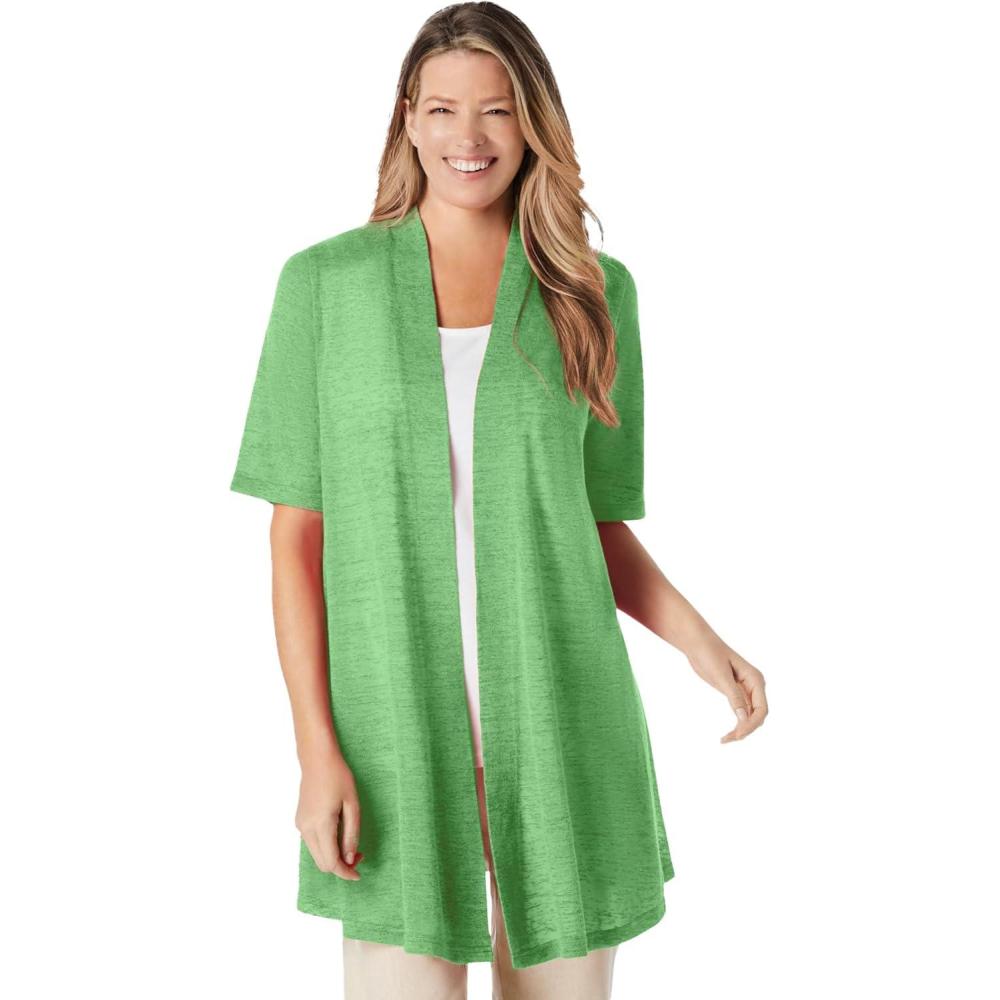 Perfect for layering, offering effortless style and light coverage. br> Flattering elbow-length sleeves for an easy, breezy fit. br> Ideal to wear over tops or dresses for added coverage. br> 34″ length provides a modest and comfortable fit. br> Made from a breathable linen/poly blend for ultimate comfort. br> Machine washable for easy care and maintenance. br> Imported