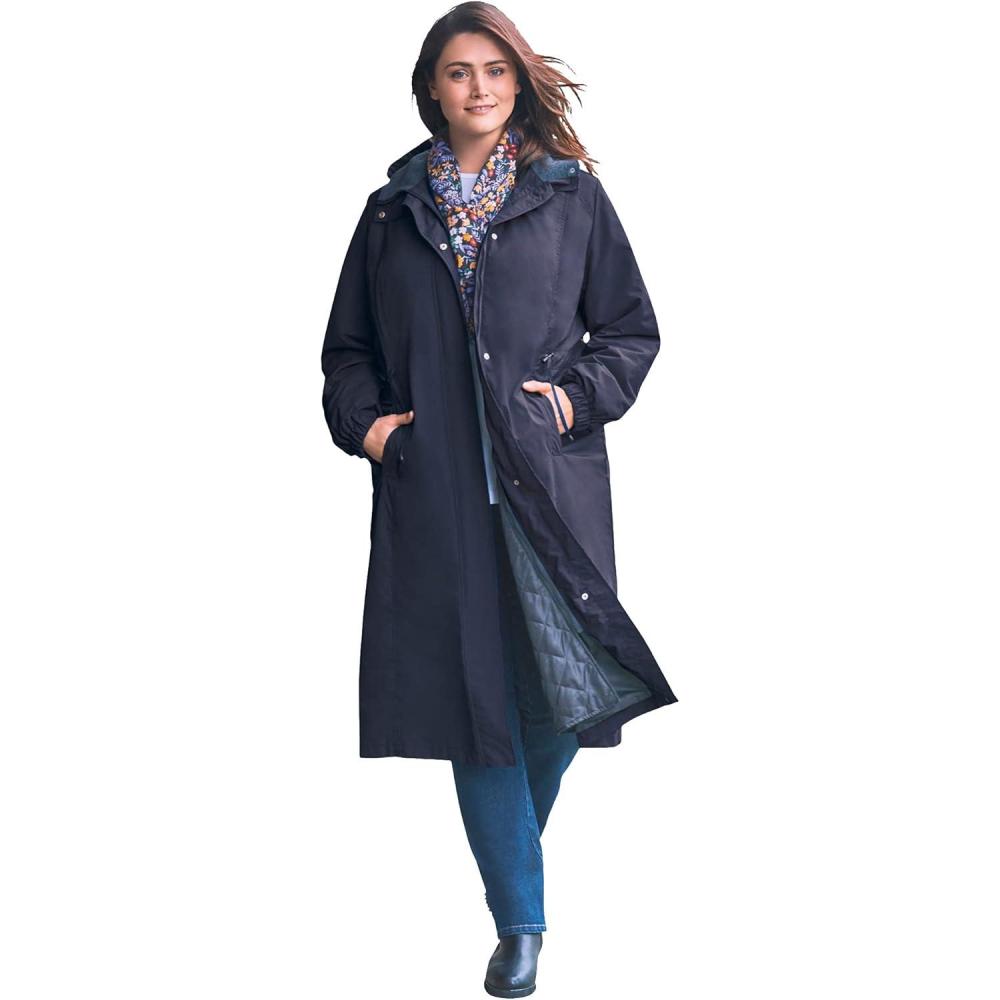 Woman Within Plus Size Long Hooded Taslon Jacket(Navy)