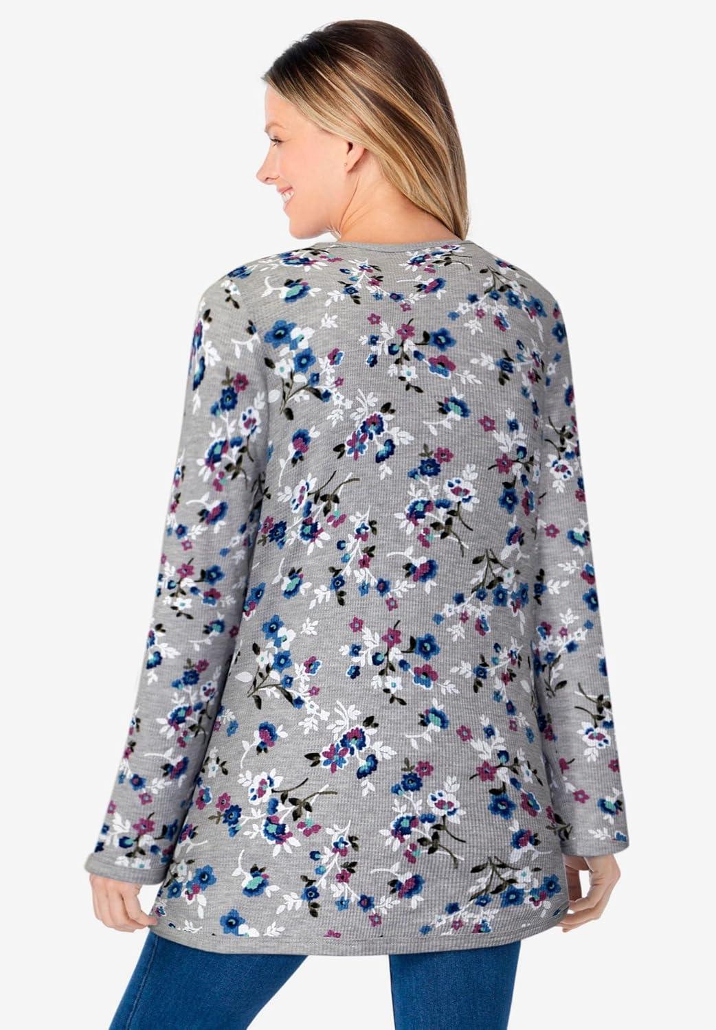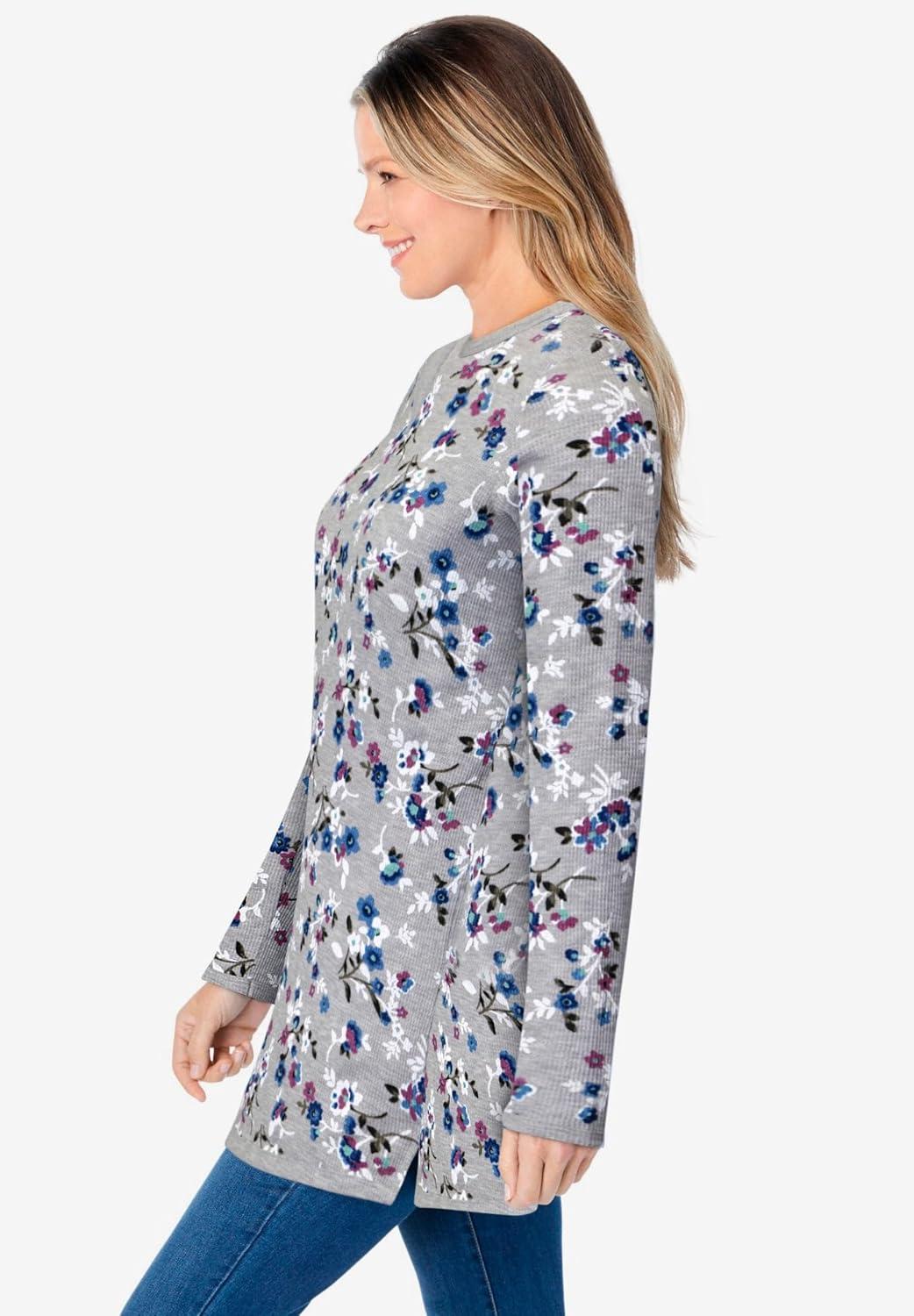 Woman Within Plus Size Long-Sleeve Crewneck Soft Waffle Knit Thermal Shirt(Heather Grey Multi Delicate Floral)