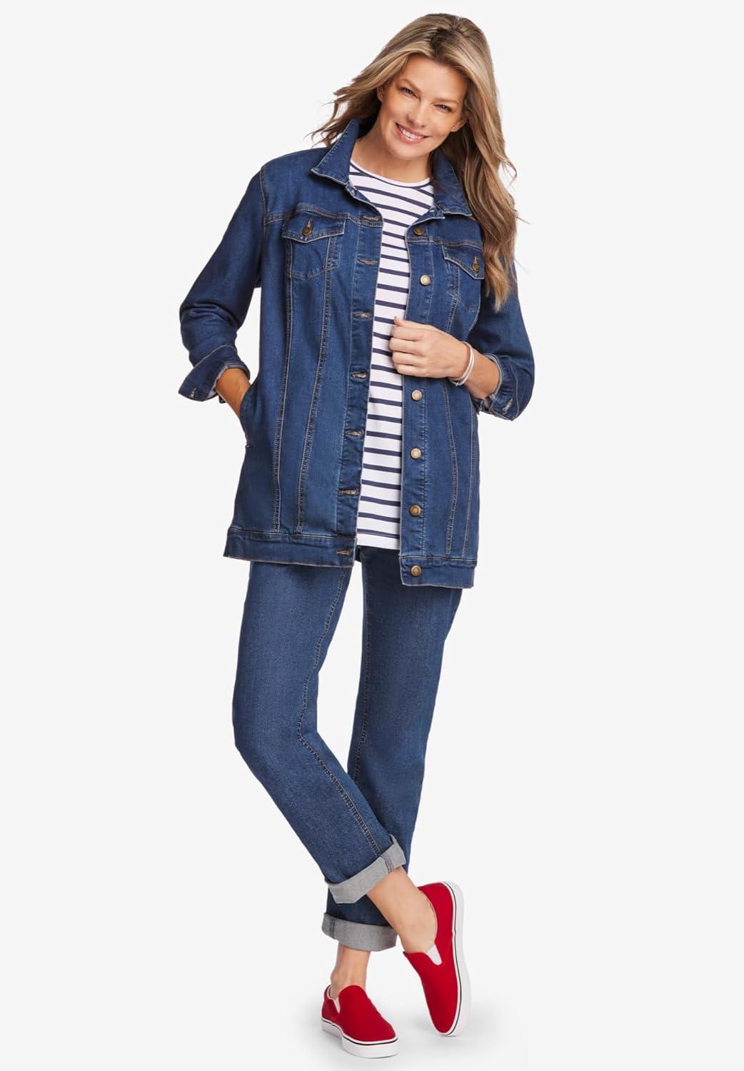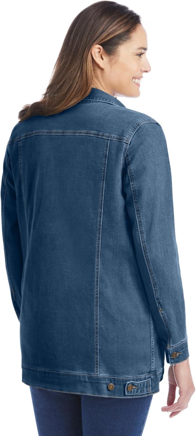 Our Long Stretch Denim Jacket is a longer length take on the classic style. It has a flattering A-line shape and is easy to move around in thanks to added stretch. This jacket is sure to be your new go-to. A-line coat hits mid-thigh br> Flap pockets add functional details br> Side hem adjusters br> 30″ length br> Cotton/poly/rayon/spandex; imported br> Machine washable