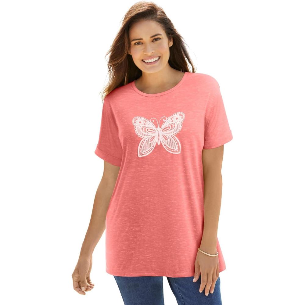 Woman Within Plus Size Marled Cuffed-Sleeve Tee(Sweet Coral Butterfly)