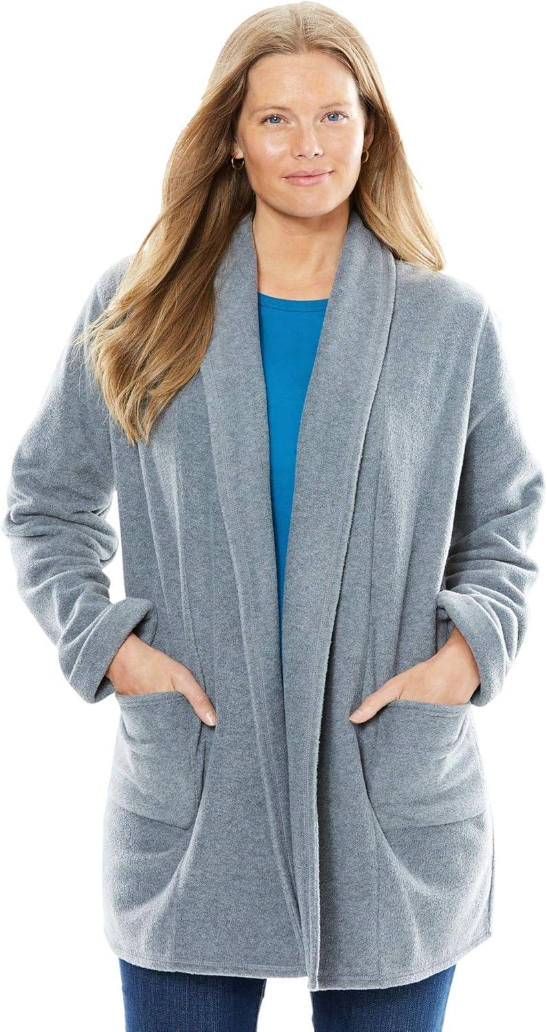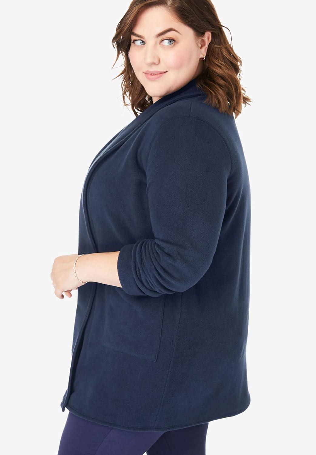 Woman Within Plus Size Microfleece Cardigan Shawl Collar Oversized Long Open Jacket(Black)