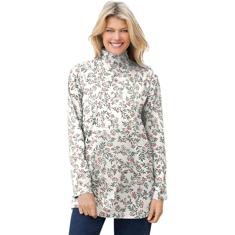 Woman Within Plus Size Mockneck Long-Sleeve Tunic(Ivory Leaf Print)