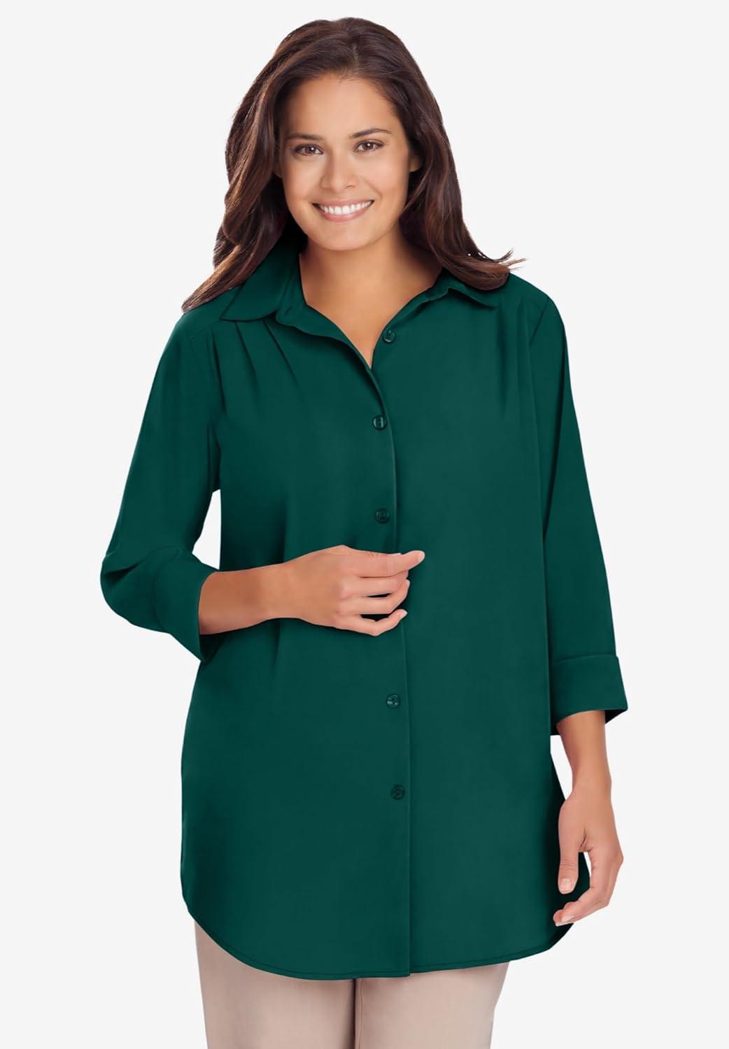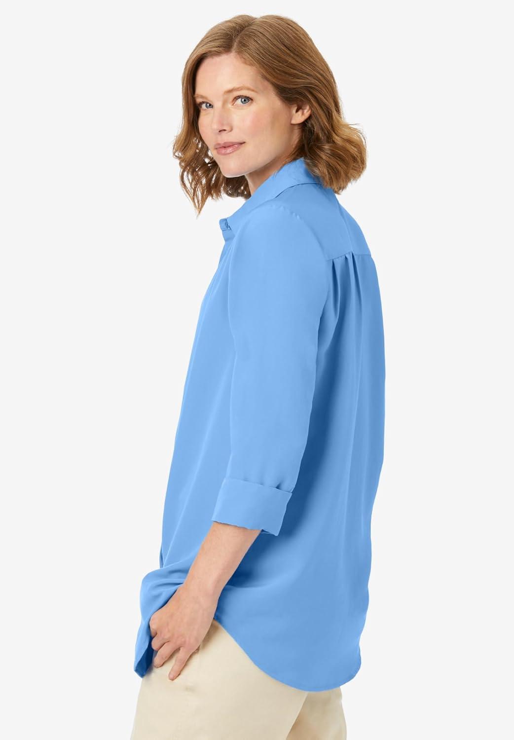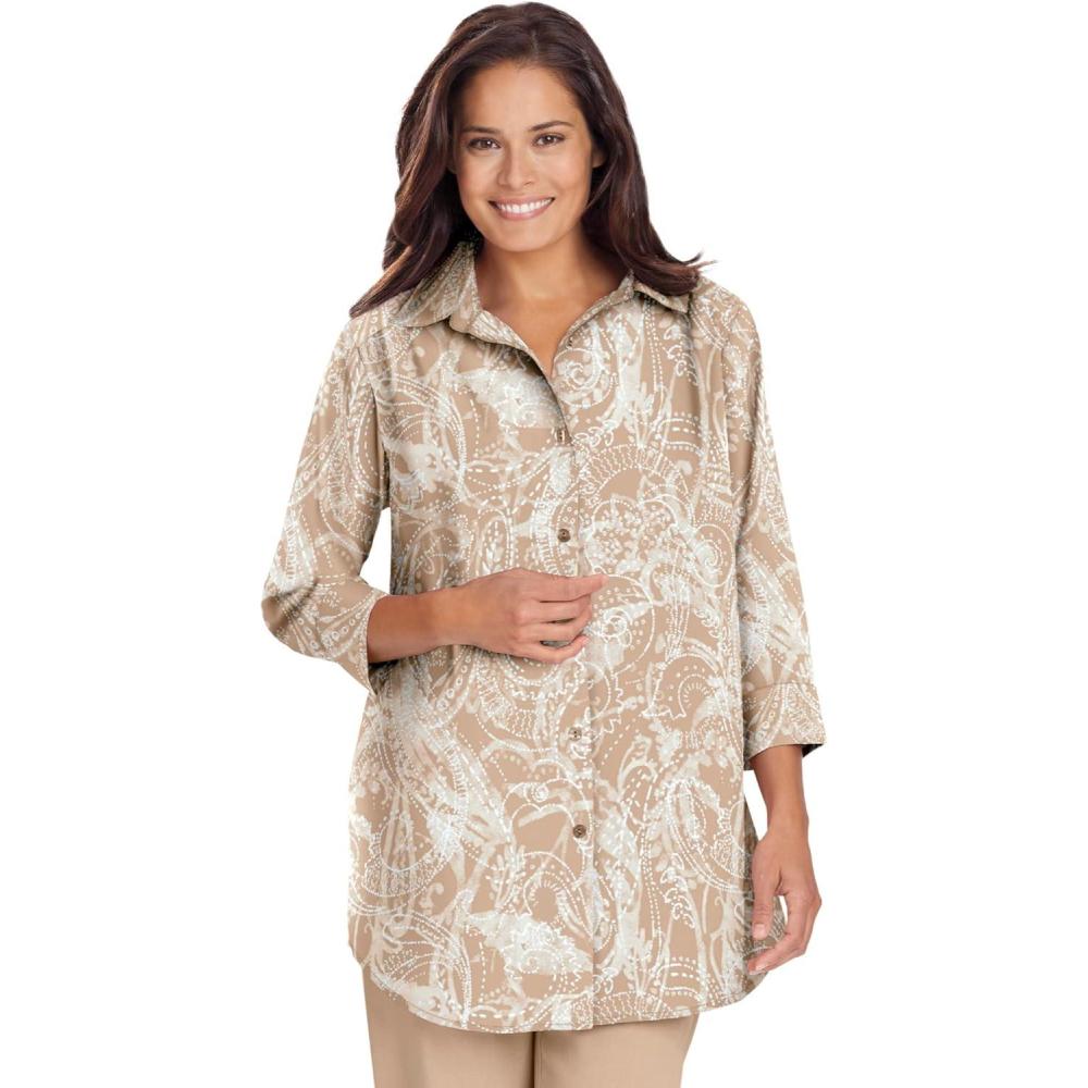 Woman Within Plus Size No Iron Three-Quarter Sleeve Peachskin Shirt(New Khaki Paisley)