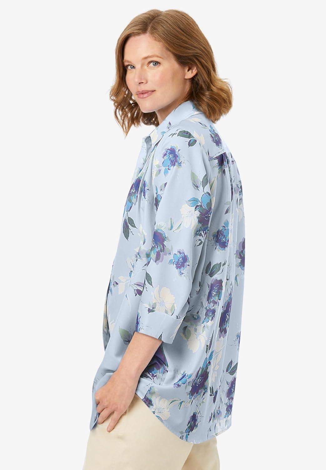Woman Within Plus Size No Iron Three-Quarter Sleeve Peachskin Shirt(Pearl Grey Romantic Floral)