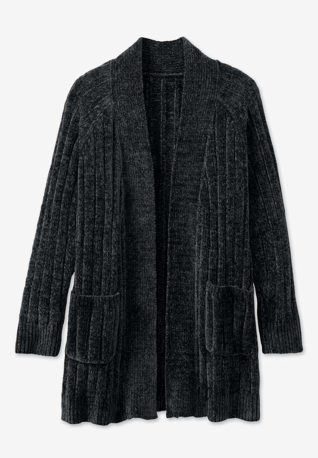 An easy layer, this great everyday cardi is made in soft chenille to add warmth and style to your favorite tees and tops. A ribbed texture adds even more plushness that will keep you extra cozy. Patch front pockets br> 32″ length br> Poly, imported br> Machine washable