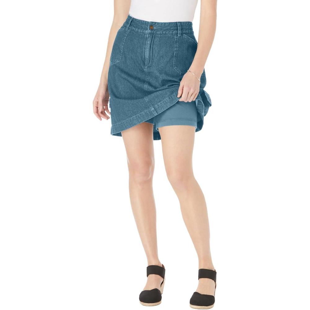 This denim skort combines the classic look of a skirt with the comfort of shorts. Our Perfect Denim is made from non-stretch 100% cotton that gives you a custom-feeling fit as you wash and wear. Classic denim skirt with belt loops and a single shank button/zip closure for a secure fit. br> Integrated cotton/spandex shorts provide ultimate comfort and flexibility. br> 20″ length skirt for a modest and stylish look. br> Side flap cargo pocket with button closure. br> Two front pockets plus back flap pockets. br> Chafe-free skort. br> Non-stretch 100% cotton for breathable, long-lasting quality. br> Easy to care for – machine washable. br> Imported