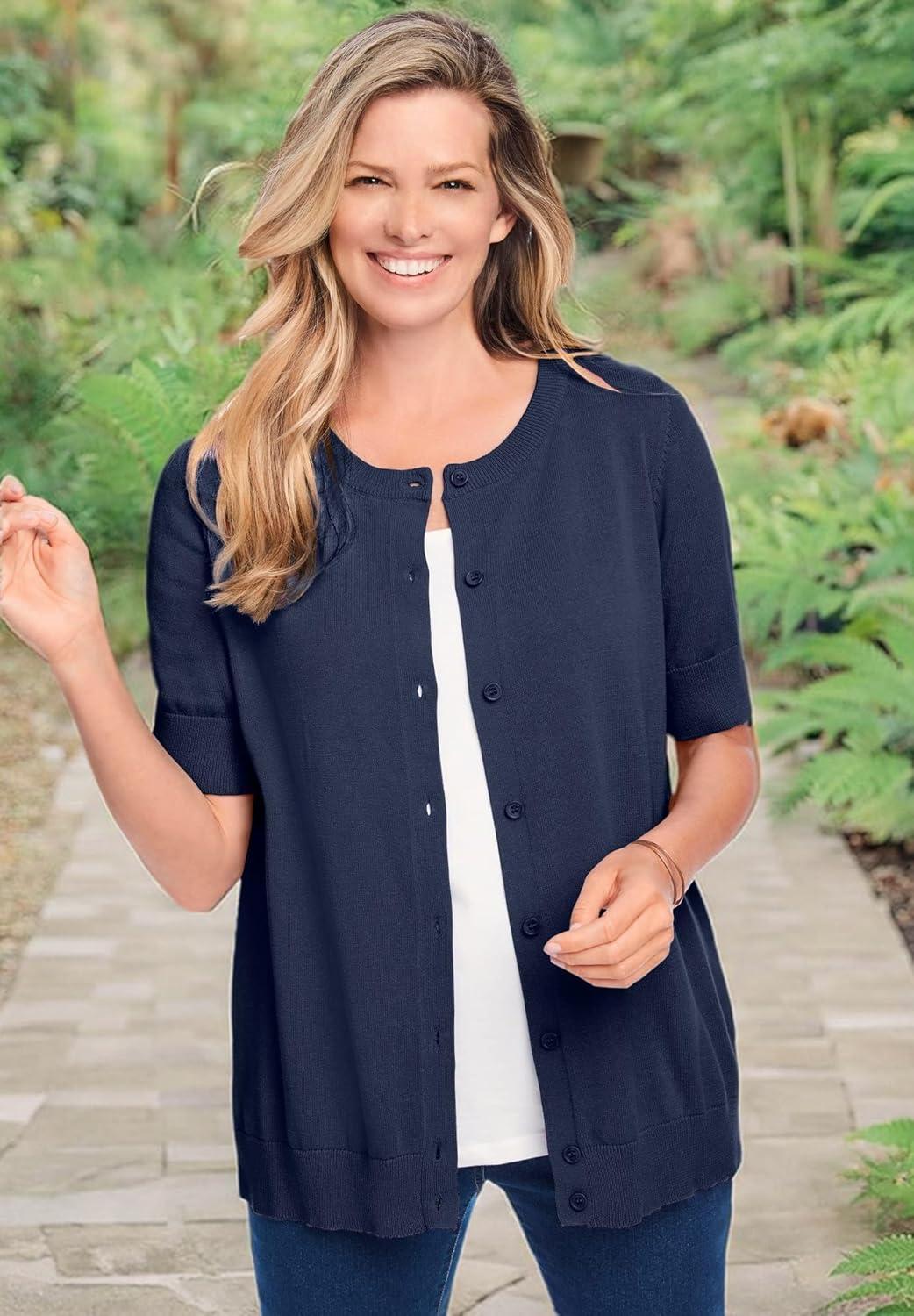 Effortlessly layer this button-front cardigan for year-round comfort and style. br> Perfect alone or over a tank, and ideal for office layering or cooler evenings. br> Enjoy the elbow-length sleeves for added coverage on warmer days. br> Alternative to a jacket with a shorter, more versatile sleeve length. br> Made from pure cotton for excellent breathability and comfort. br> Features a ribbed crewneck, cuffs, and hem for a polished look. br> Measures 28″ in length to provide the right amount of coverage. br> Machine washable for easy care, keeping convenience in mind. br> Imported br>