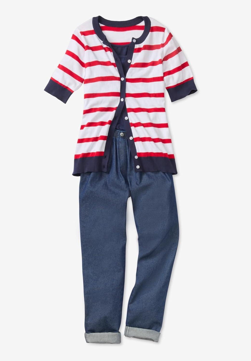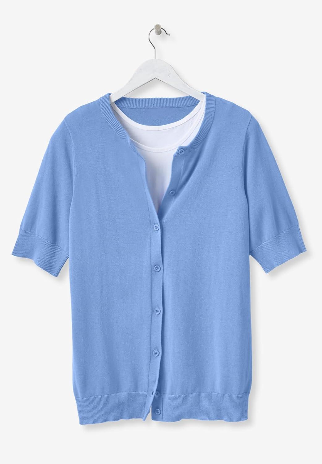 Effortlessly layer this button-front cardigan for year-round comfort and style. br> Perfect alone or over a tank, and ideal for office layering or cooler evenings. br> Enjoy the elbow-length sleeves for added coverage on warmer days. br> Alternative to a jacket with a shorter, more versatile sleeve length. br> Made from pure cotton for excellent breathability and comfort. br> Features a ribbed crewneck, cuffs, and hem for a polished look. br> Measures 28″ in length to provide the right amount of coverage. br> Machine washable for easy care, keeping convenience in mind. br> Imported br>