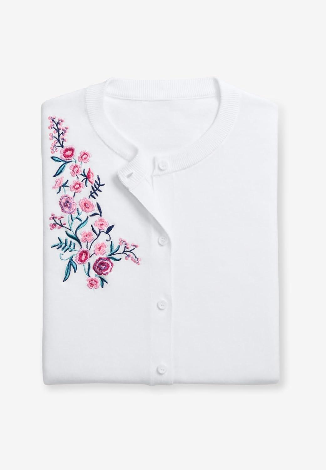 Woman Within Plus Size Perfect Elbow-Length Sleeve Cardigan Sweater(White Butterfly Garden)