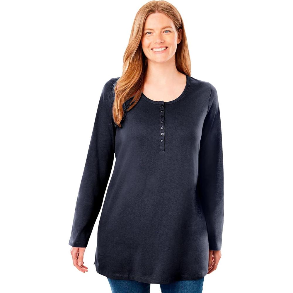 Woman Within Plus Size Perfect Long-Sleeve Henley Tee(Navy)