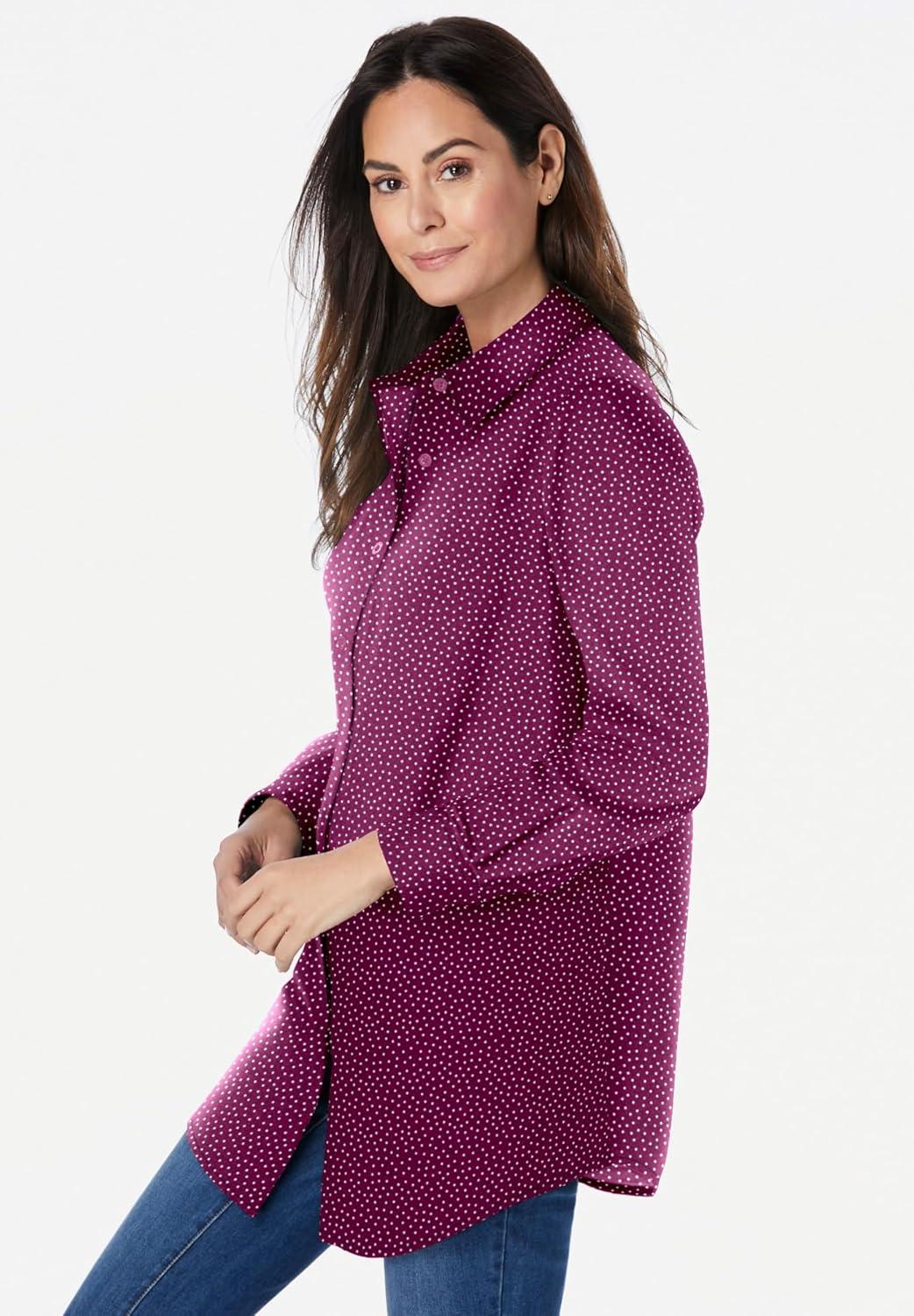 Woman Within Plus Size Perfect Long Sleeve Shirt(Deep Claret Allover Dot)