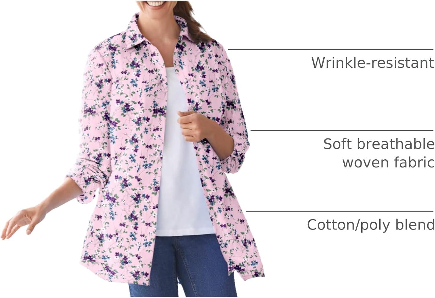Experience ultimate comfort with our classic, wrinkle-resistant Perfect Long Sleeve Shirt, designed to keep you looking stylish all day long. br> The timeless shirt is an essential for every wardrobe. br> Convenient button-front with placket ensures the perfect fit for any occasion. br> Button cuffed long sleeves provide a tailored look while allowing for easy adjustments and versatility. br> Flattering shirttail hem. br> Generous 30″ length gives you the coverage you desire, enabling you to move with confidence. br> Petite: 28″ length. br> Crafted from a soft, breathable woven cotton/poly blend for a lightweight feel that maintains its shape. br> Easy care with machine wash – spend less time worrying about laundry and more time enjoying your day. br> Imported