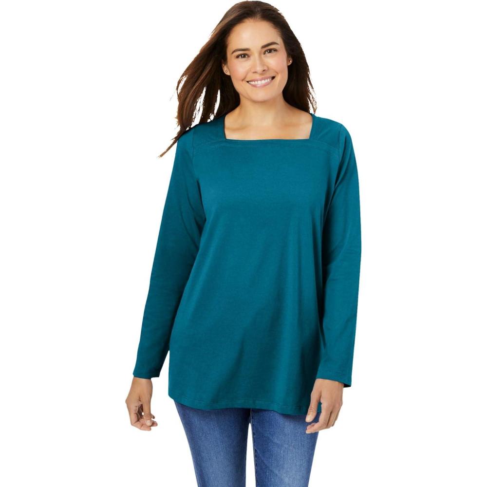 Woman Within Plus Size Perfect Long-Sleeve Square-Neck Tee(Deep Teal)