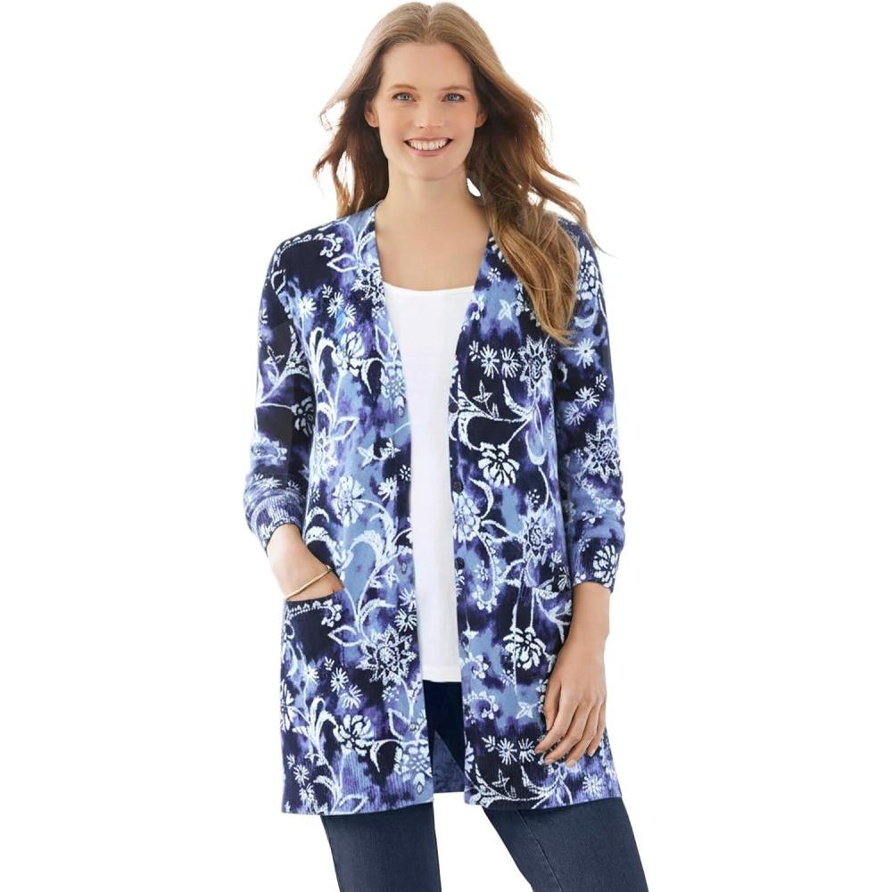 Woman Within Plus Size Perfect Longer-Length Cotton Cardigan(Navy Floral Tie Dye)