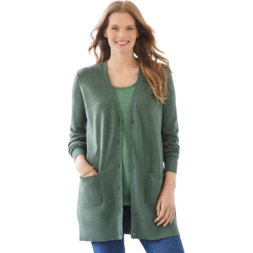 Woman Within Plus Size Perfect Longer-Length Cotton Cardigan(Pine)