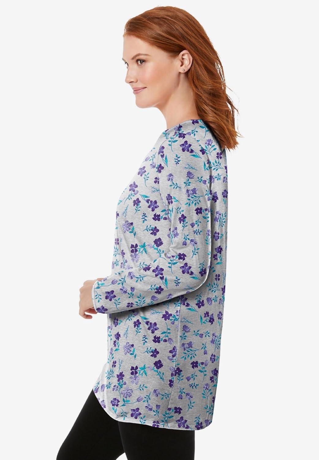 Woman Within Plus Size Perfect Printed Long-Sleeve Crewneck Tunic(Heather Grey Pretty Floral)