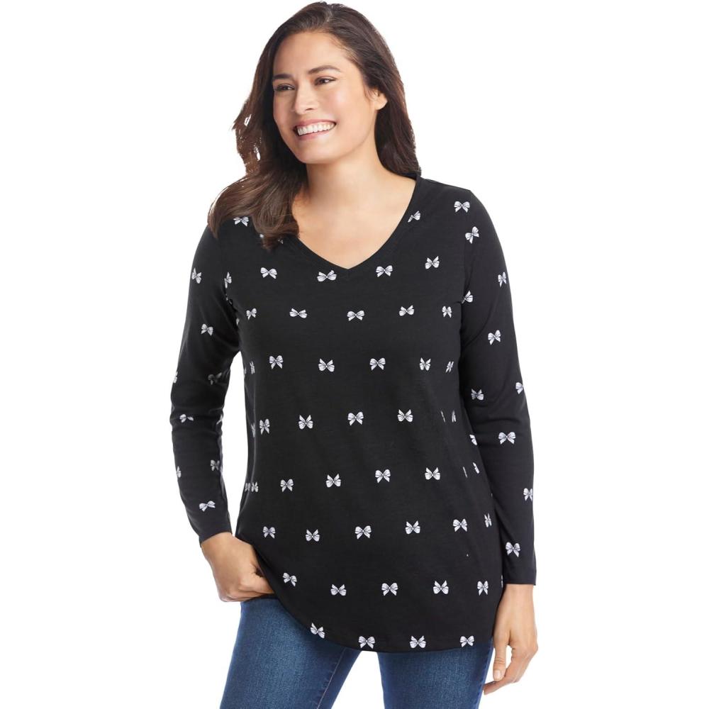 Woman Within Plus Size Perfect Printed Long-Sleeve V-Neck Tee(Black Sweet Bows)