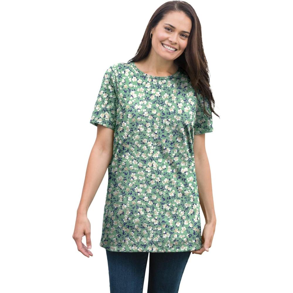 Woman Within Plus Size Perfect Printed Short-Sleeve Crewneck Tee(Sage Blossom Vine)