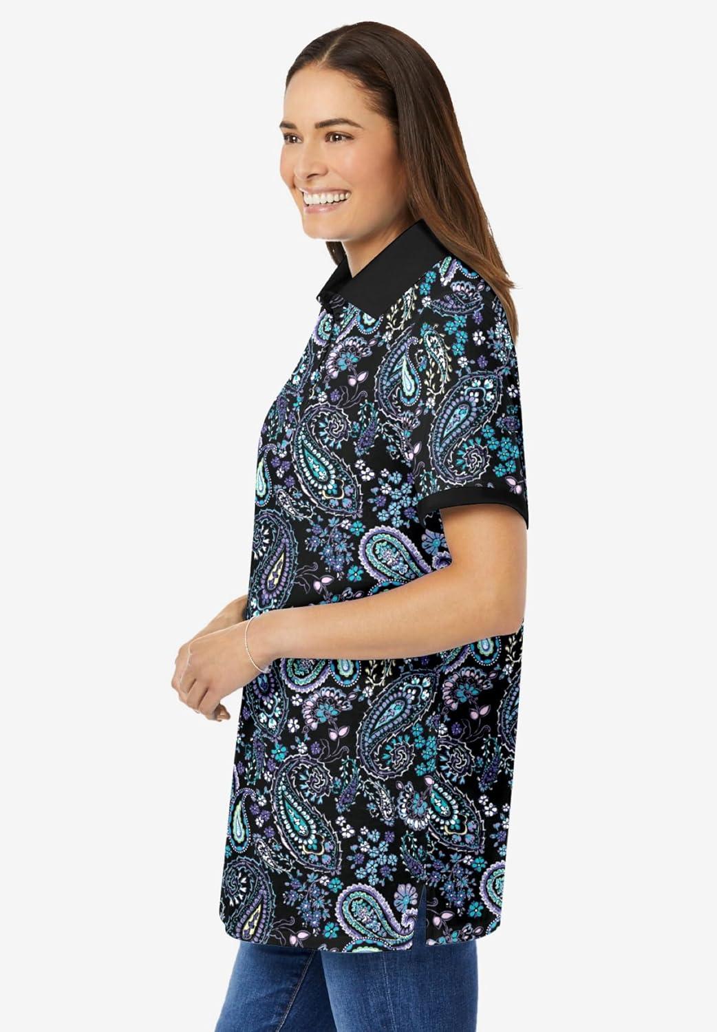 Woman Within Plus Size Perfect Printed Short-Sleeve Polo Shirt(Black Paisley)